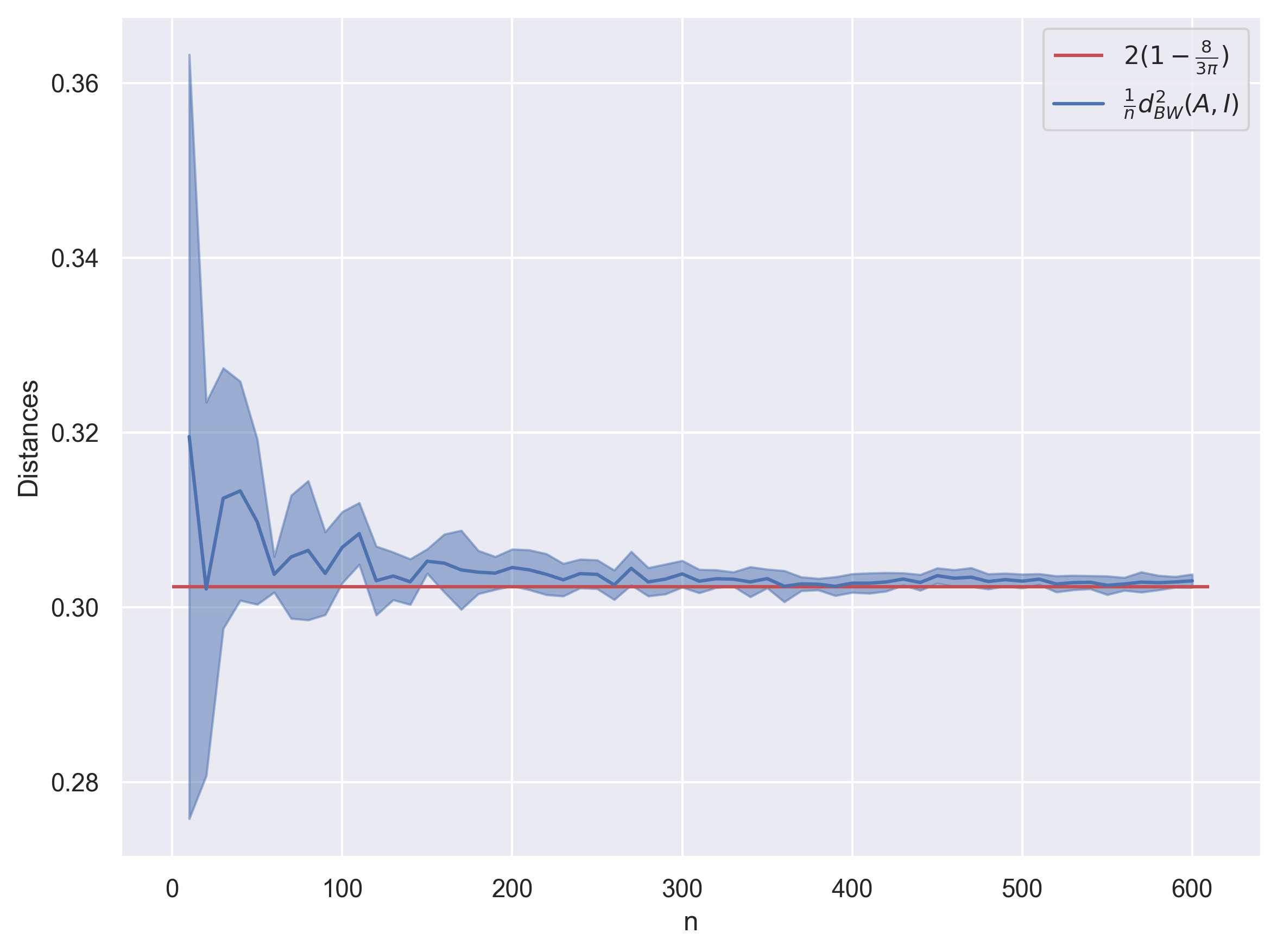 \[\lim_{n \to \infty} \frac{1}{n}d^2_{\mathrm{BW}}(\Sigma_n, I) = \lim_{n \to \infty} \frac{1}{n}\mathrm{tr}(\Sigma_n + I - 2\Sigma_n^{1/2}) = 2(1-\frac{8}{3\pi})\]Finally, we test it numerically and witness the desired convergence.